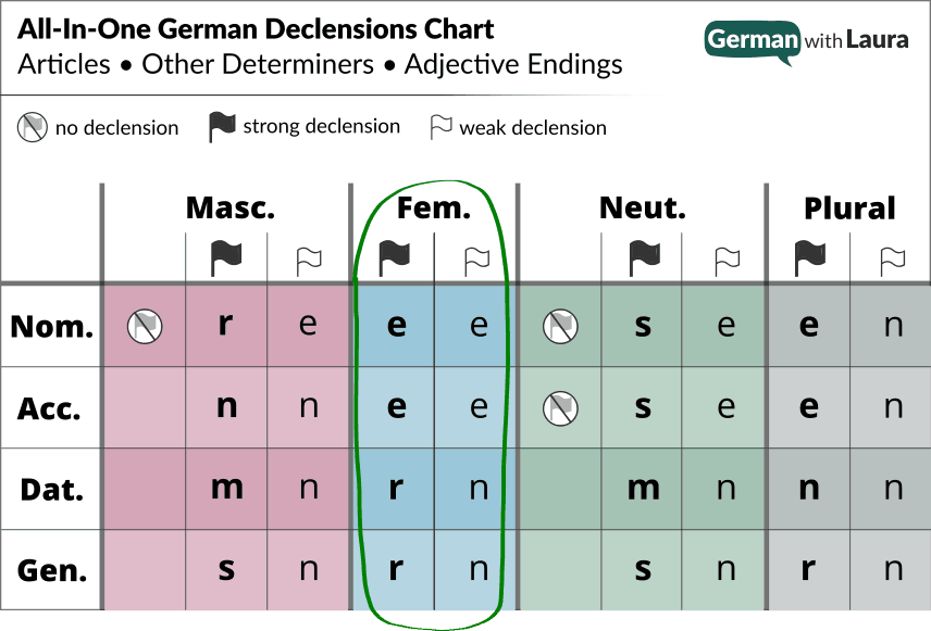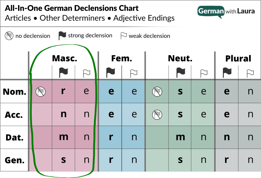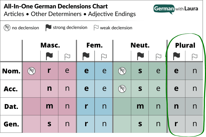 Being aware of these declension patterns is the 1st step in learning adjective endings smarter, not harder. And the 2nd step is working with my All-In-One German Declensions Chart. 👍