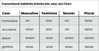 Similarly, the many ways of saying ‘a’ in German are usually taught with this chart: