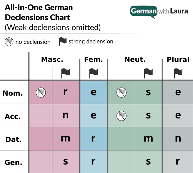 Here, again, is the abbreviated chart (no weak declensions listed). For the full chart and how to use it, read my guide on declensions.