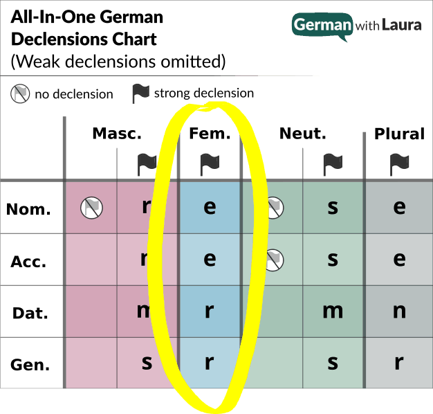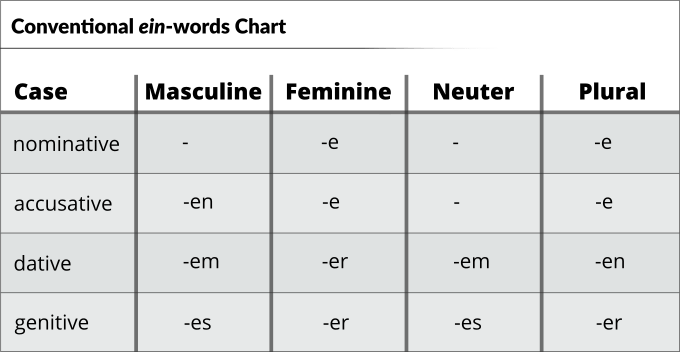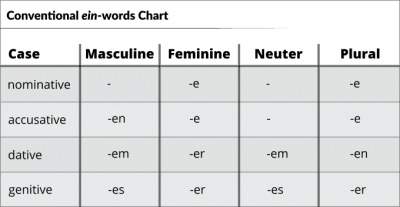 Again, if you know your noun’s gender & case and whether you’re using an ein-word in one of the 3 exception spots, you will always know which declension your determiner needs.