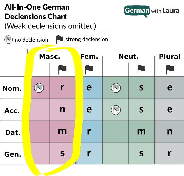 - All possible declensions are r-, n, -e, -m, and -s.Which one you use when depends on if your noun is masculine, feminine, neuter, or plural AND whether it’s in the nominative, accusative, dative, or genitive case AND which declensions pattern you’re using (e.g. do you need to put declensions on just a determiner? just an adjective? on both? etc.)