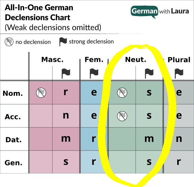 - Drill into your head the THREE exception spots on the chart where it actually matters if your determiner is an ein-word or not: masculine nominative, neuter nominative, neuter accusative. Invest extra practice into writing sentences with masculine / neuter nouns in those cases so that you get super-used to the difference between using the strong declension for the der-words and no declension for the ein-words!