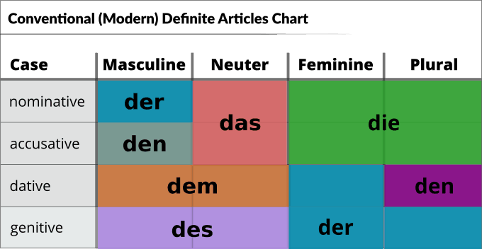 Either way, we have a chart that tells us specifically how to say ’the’ in German — six different ways!