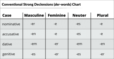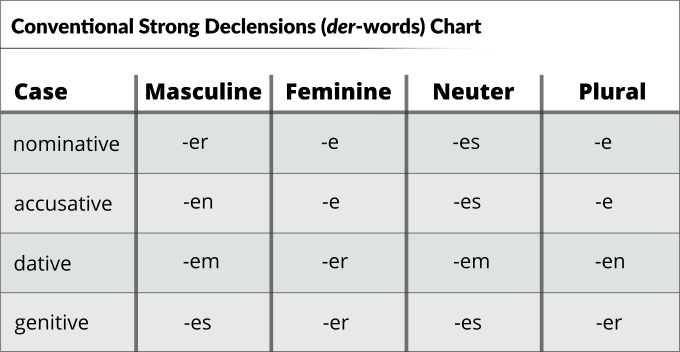 Der-words all take what are called strong declensions <– rather implies that there’s at least one other type of declensions … possibly weak declensions. 😉